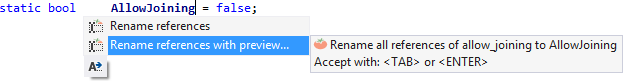 Enter the new name for your symbol, and select the scope of the rename. You can preview references before committing to the refactoring.