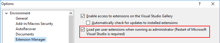 Only if you run Visual Studio as administrator, confirm extensions may be loaded in Tools | Options | Environment | Extensions and Updates.
