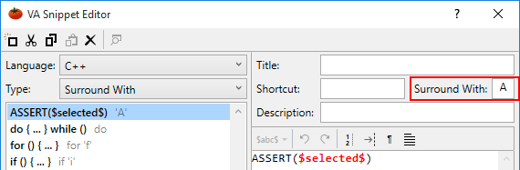 Access is also available by selecting code in the text editor and typing a preassigned character. Your selection is wrapped instead of replaced. Assign the character in the definition of your VA Snippet for Surround With.