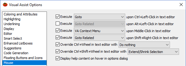 The functionality of the mouse buttons and wheel is fixed in Visual Studio. Visual Assist extends the built-in functionality by allowing assignment of commands to modified versions of the buttons and wheel. The assignments are made in the options dialog of Visual Assist. The scope of the assignments is the text editor.