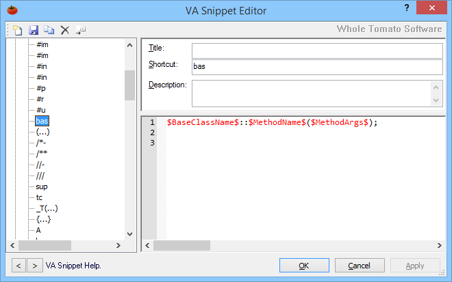 Visual Assist installs with two VA Snippet editors, the older of which is available in Visual Studio 2008 and older IDEs. You can use the editor to create, modify, and delete VA Snippets.